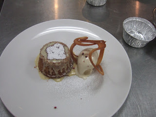 This was my own creation, of which I am very proud. It was part of our menu project, in which we had to conceptualize a restaurant, and create a dessert menu for it. Our chefs chose 2 dishes, and we had to create and present them. This is a brown butter nutmeg baumkuchen, with caramel blood oranges, candied fennel, and earl grey ice cream.
